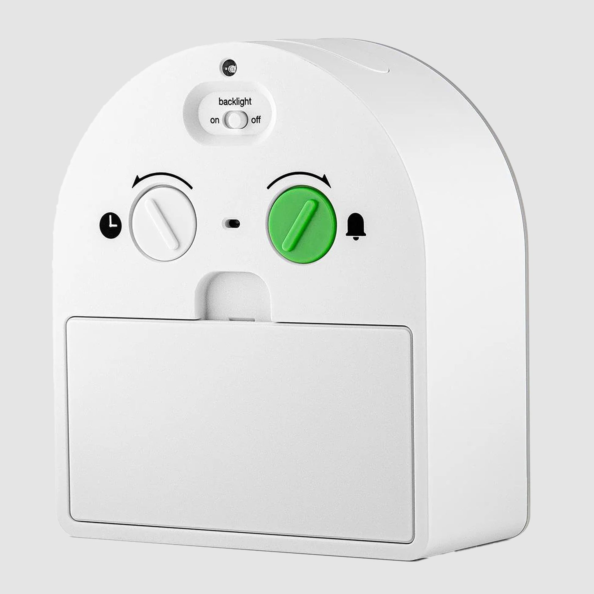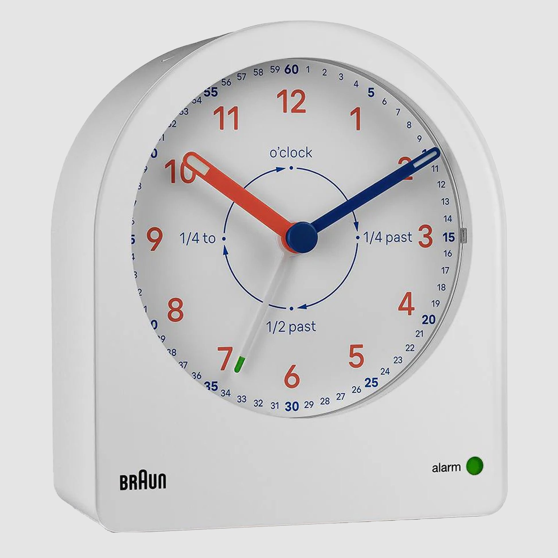 Braun Analogue Time Teacher Alarm Clock with Snooze and Continuous Backlight, Quiet Quartz Movement, Easy to Read Dial, Crescendo Beep Alarm in White, model BC22TW.