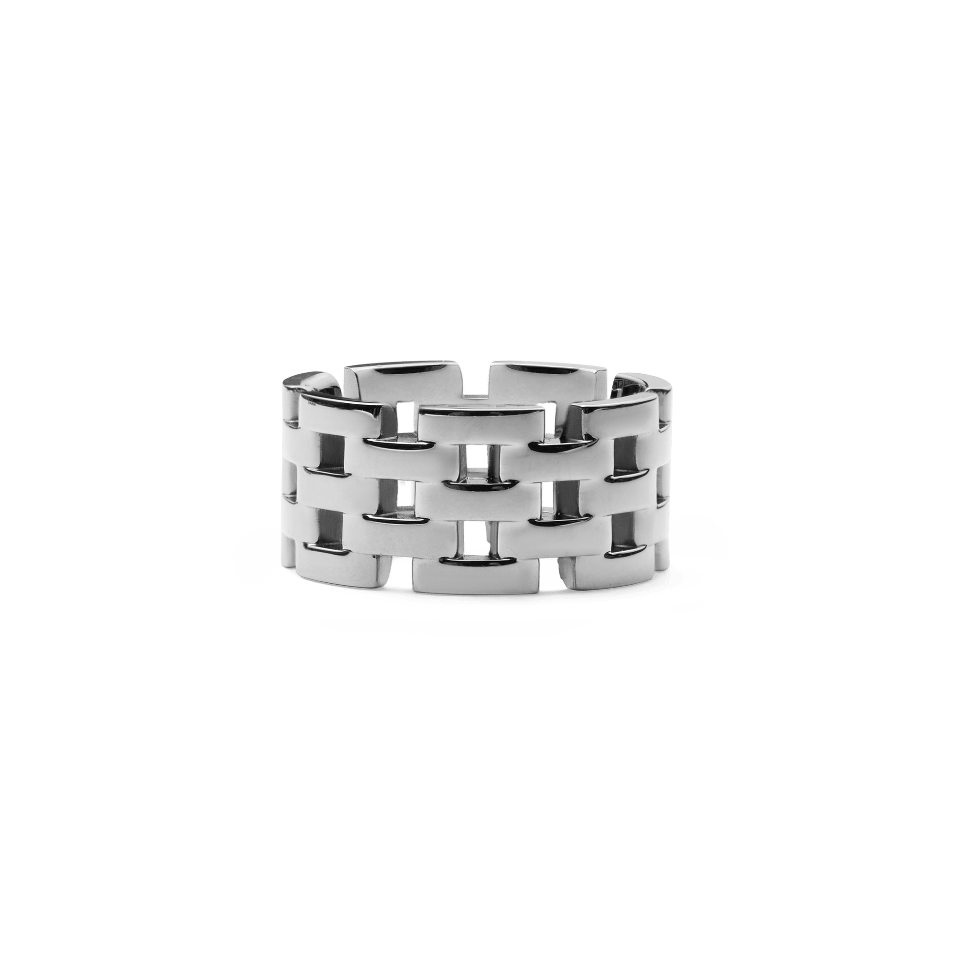 This silver ring was designed to match the aesthetic of our link watch straps—but in a smaller, more jewelry-like form. We kept the proportions intact while introducing subtle gaps between the links for an even more refined look. Worn alone or perfectly paired with your favorite watch, the bold link design adds depth and movement to your hand.