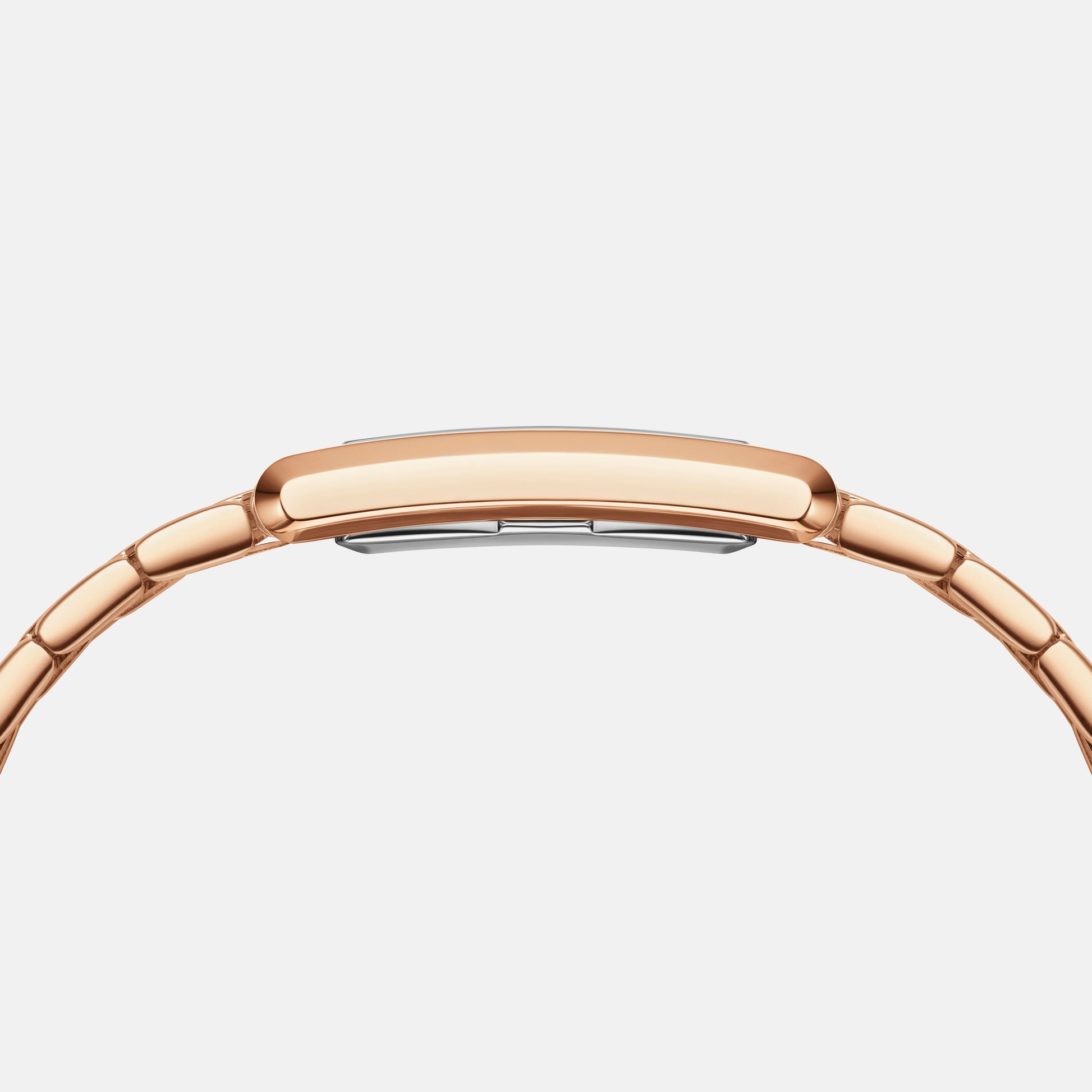 With sleek geometric edges and two sizes to choose from, our Bound collection brings perfect symmetry to your wrist. The curved rectangular case of this rose gold watch matches the exact width of its 9-link strap—giving you a seamlessly integrated emerald sunray dial.