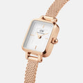The cool corners of Quadro, shrunk down into our smallest watch ever. This version of Quadro Mini features our most classic colorway, with an interchangeable rose gold mesh strap.