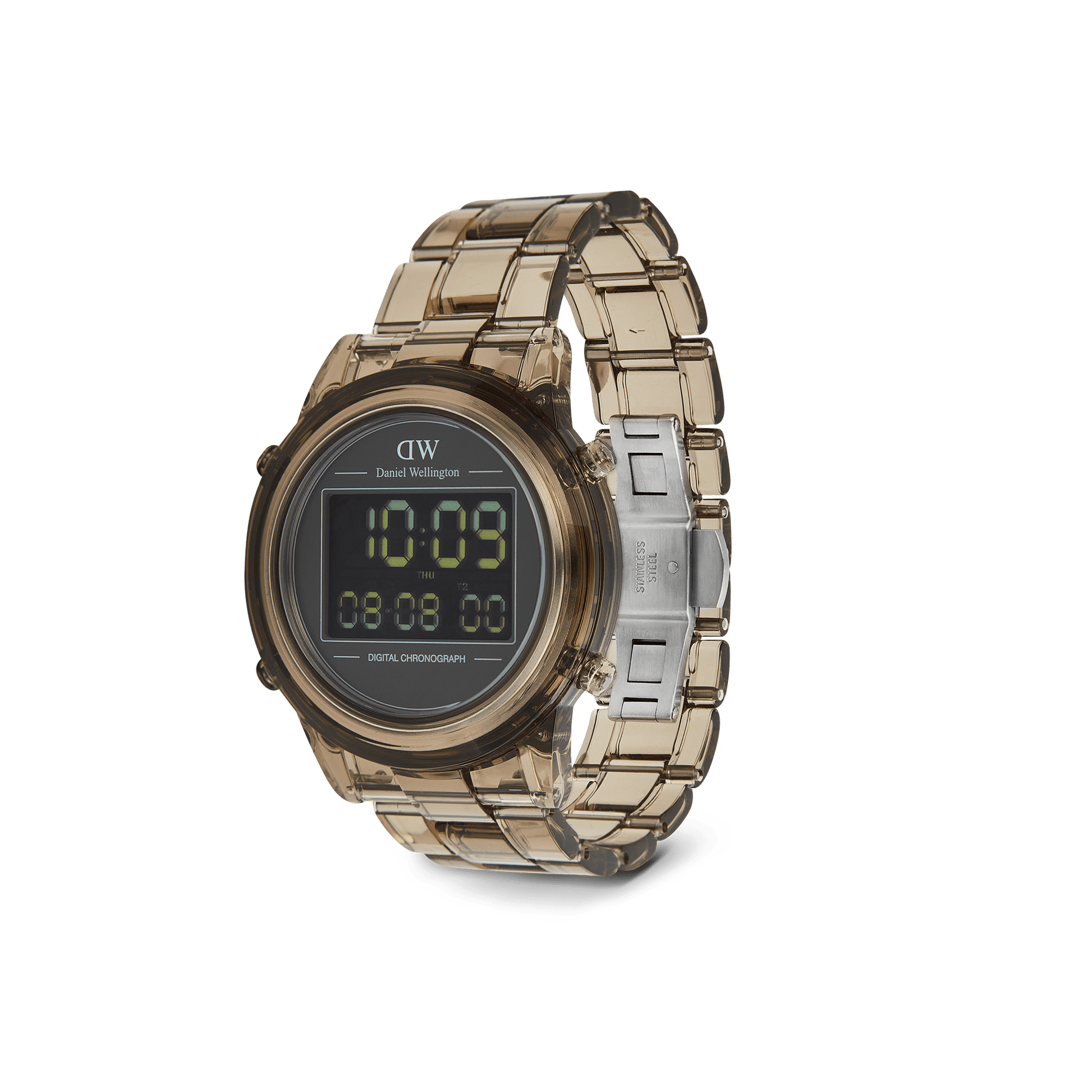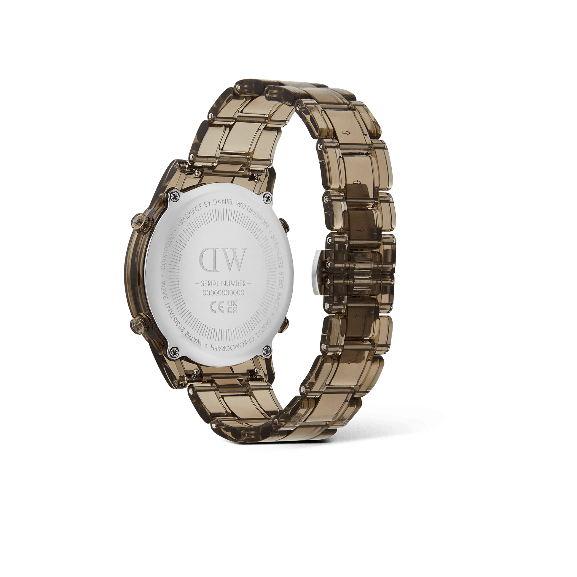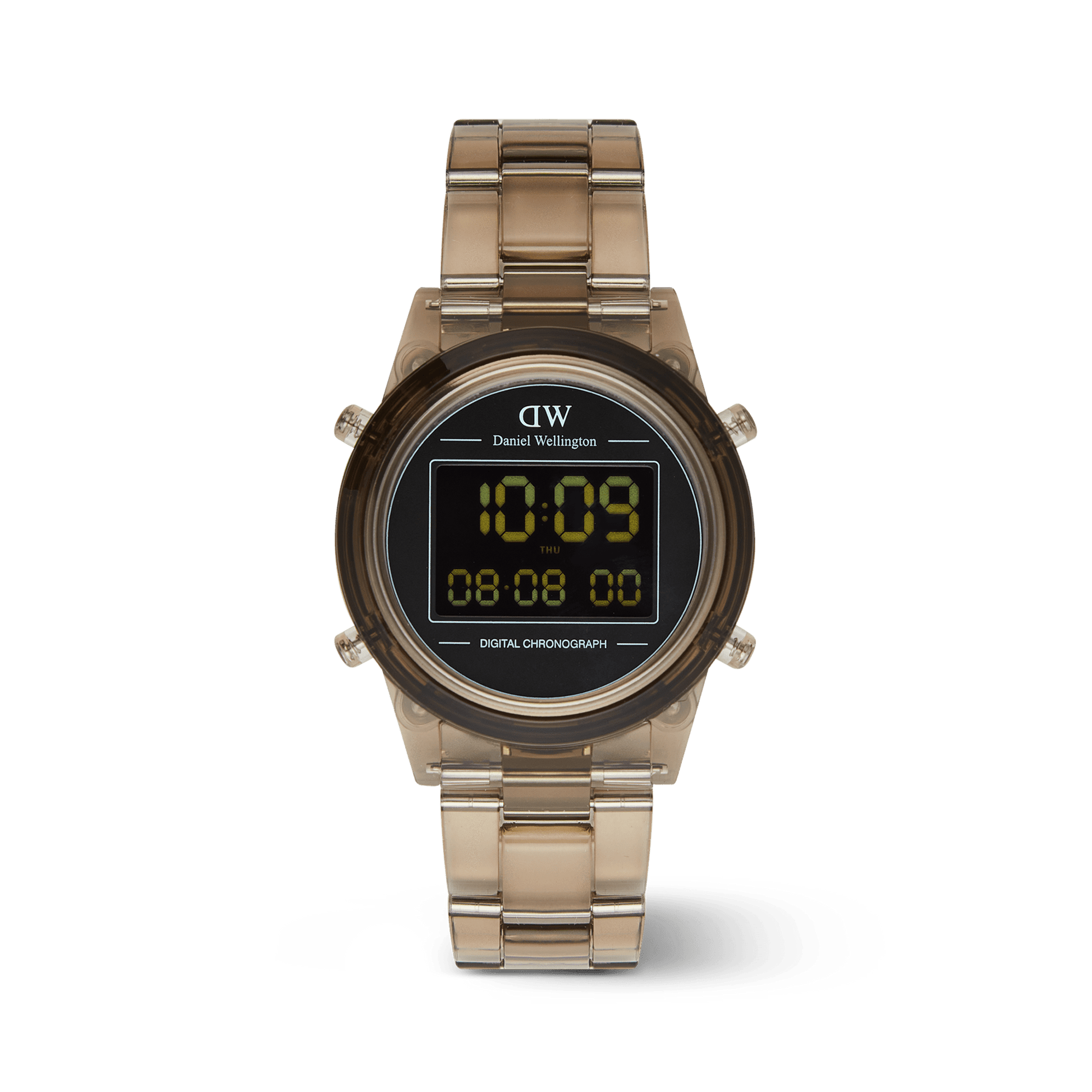 Introducing the Retro Digital Watch: a blast from the past with all the modern features you need. Crafted from transparent bio-based plastic in a cool tone colour palette, this timepiece effortlessly blends throwback charm with contemporary materials for a truly distinct aesthetic. And while its silhouette takes inspiration from our renowned Iconic Link design, we’ve gone truly digital with 10-digit dual time display, auto calendar with a daily alarm and hourly chime, and chronograph function. This dark brown version is available in two sizes.