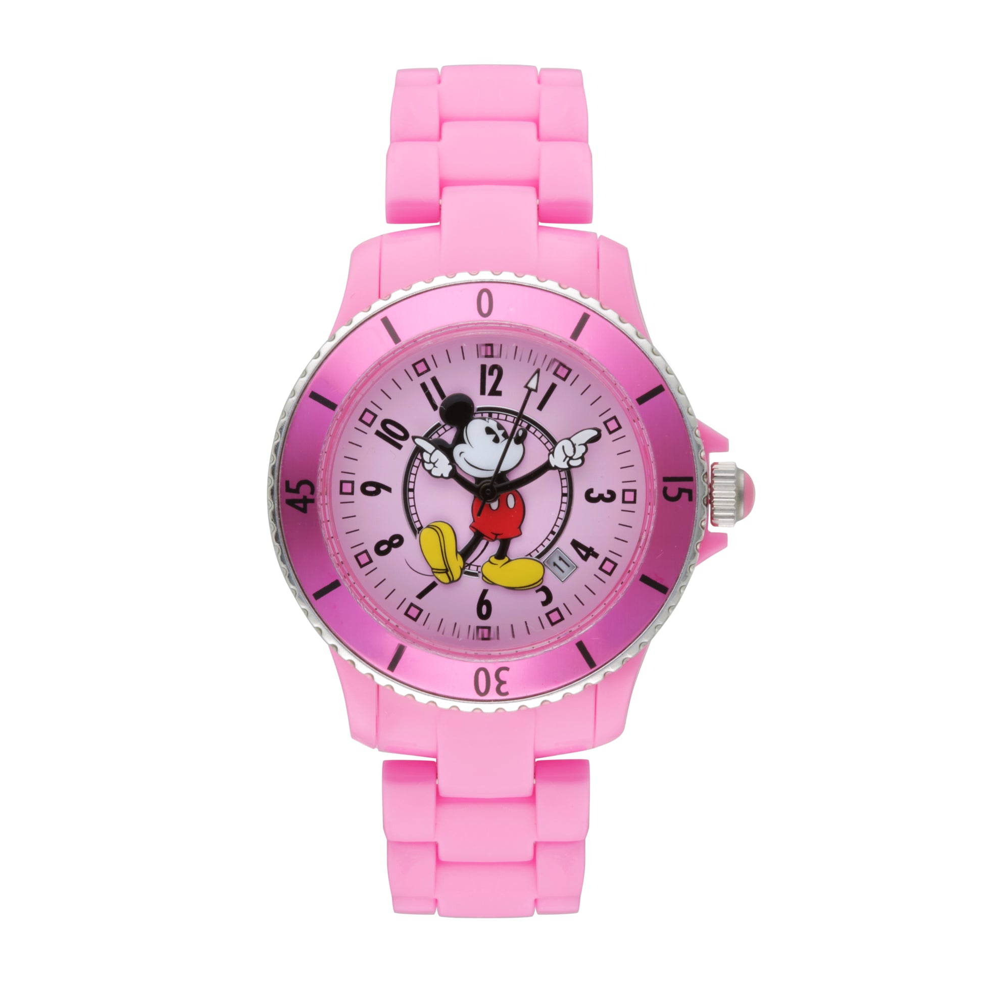 The Disney Mickey Sports 40mm Watch adds a fun pop of color with its vibrant pink dial and matching pink stainless steel case and bracelet. Featuring a playful Mickey Mouse silhouette, this bold timepiece is perfect for those who want to showcase their love for Disney in style.