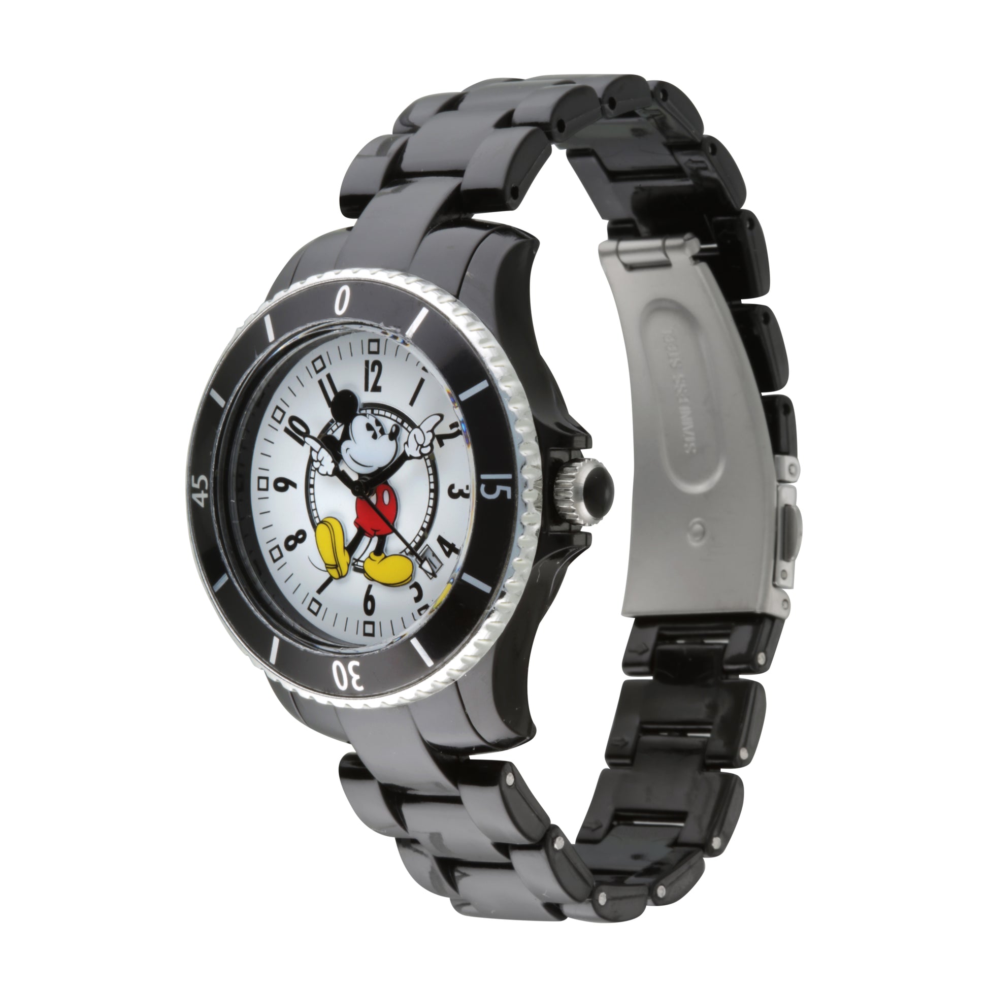 The Disney Mickey Sports 40mm Watch is a striking blend of style and character. Featuring a crisp white dial adorned with a bold Mickey Mouse silhouette, this timepiece makes a statement with its contrast against the sleek black stainless steel case and bracelet.