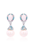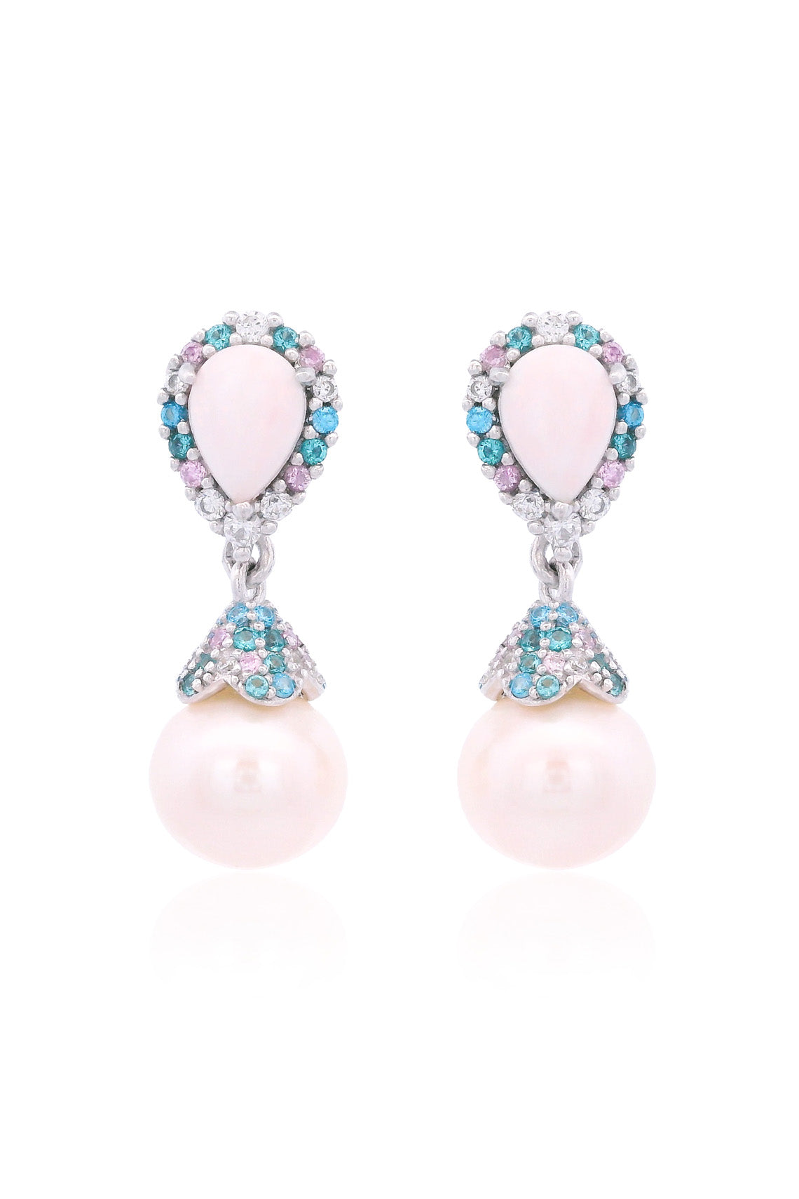 Suspended ever so sweetly beneath the opal is a glowing 7mm shell-based pearl, adorned with an intricately detailed cap that adds a hint of vintage romance. Together, they create a flowing silhouette that sparkles with every step—light, luminous, and full of feminine allure.