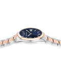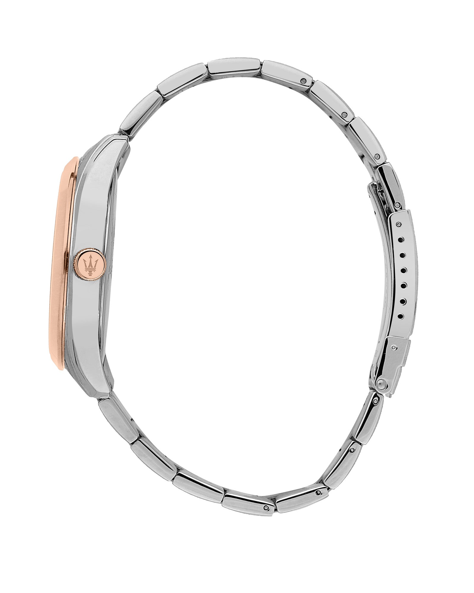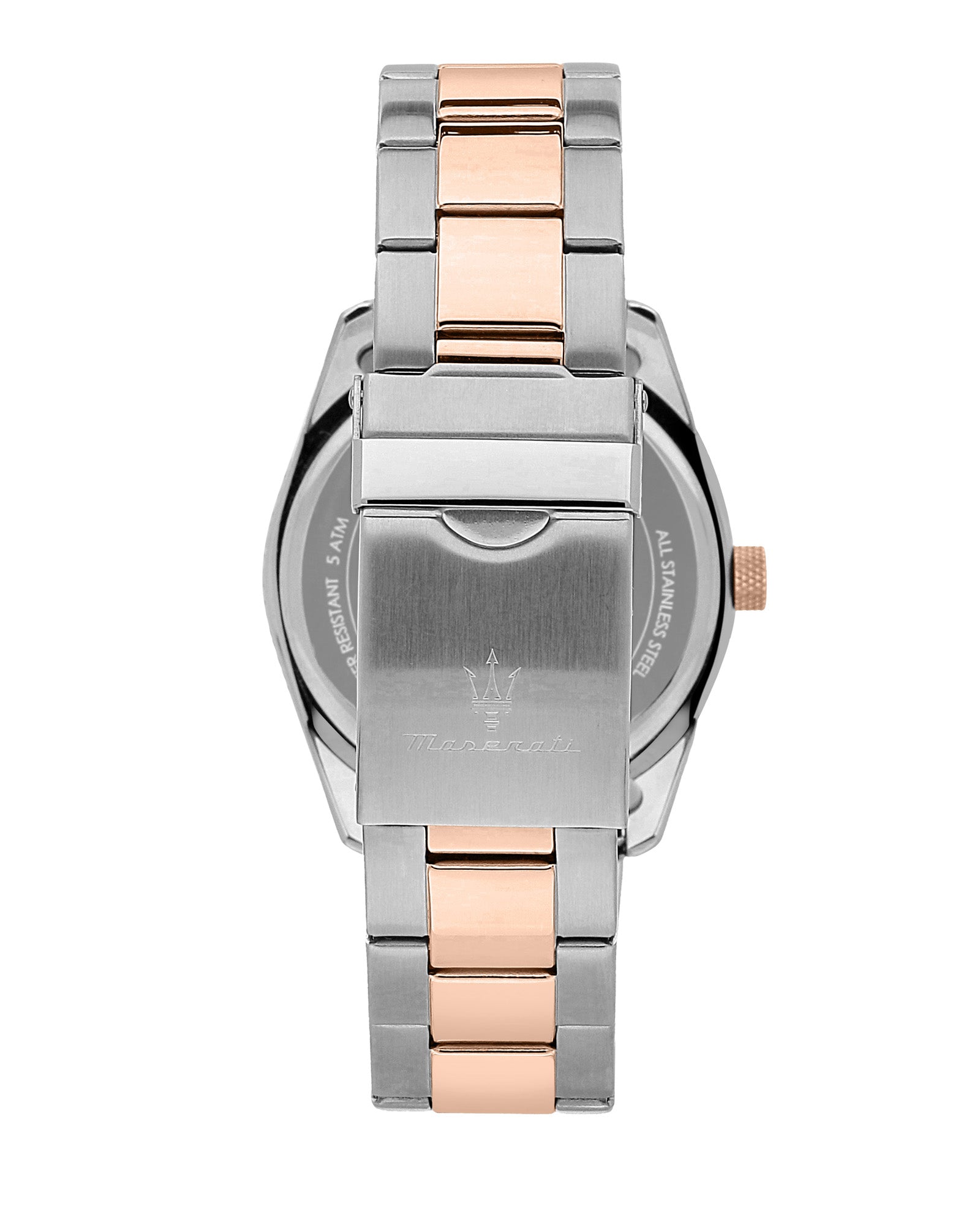Maserati Attrazione is a men's quartz watch with an elegant character. The model's envelope and bracelet are made of stainless steel in silver and pink-gold colors. Juxtaposed with them, the blue dial is decorated with a solar cut. Protection of the dial is provided by mineral glass. The product is powered by a quartz movement with a day-of-the-month date complication.