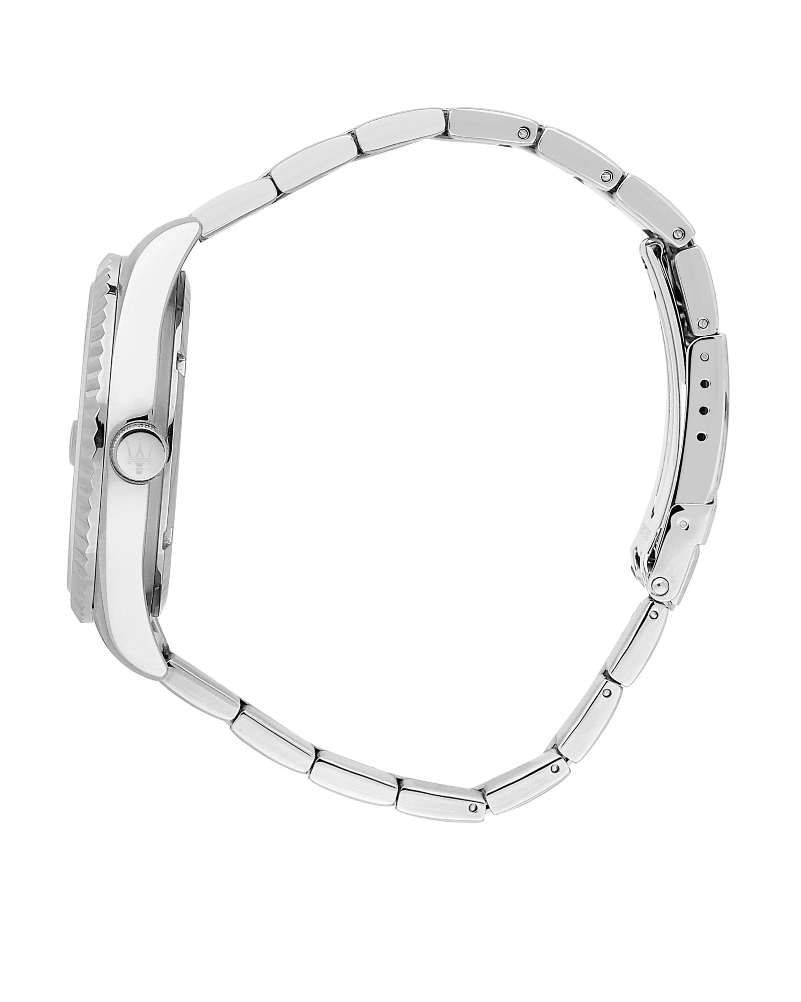 The Maserati Competizione line is characterised by a pronounced fluted bezel, with a sporty and modern design. This Maserati watch has a case made of stainless steel with a diameter of 43 mm and is fitted with a metal band. Inside the case lies a Miyota movement and the watch features a Mineral crystal. The watch is 10 ATM. This means the watch is suitable for swimming.