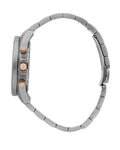 Elegant stainless steel watch is a great proposition for every man. The envelope and bracelet are made of high quality stainless steel in silver and pink -colored colors. The whole is complemented by a navy blue disc equipped with various amenities: date of the month of the month, chronograph, tachymeter and 24-hour time.