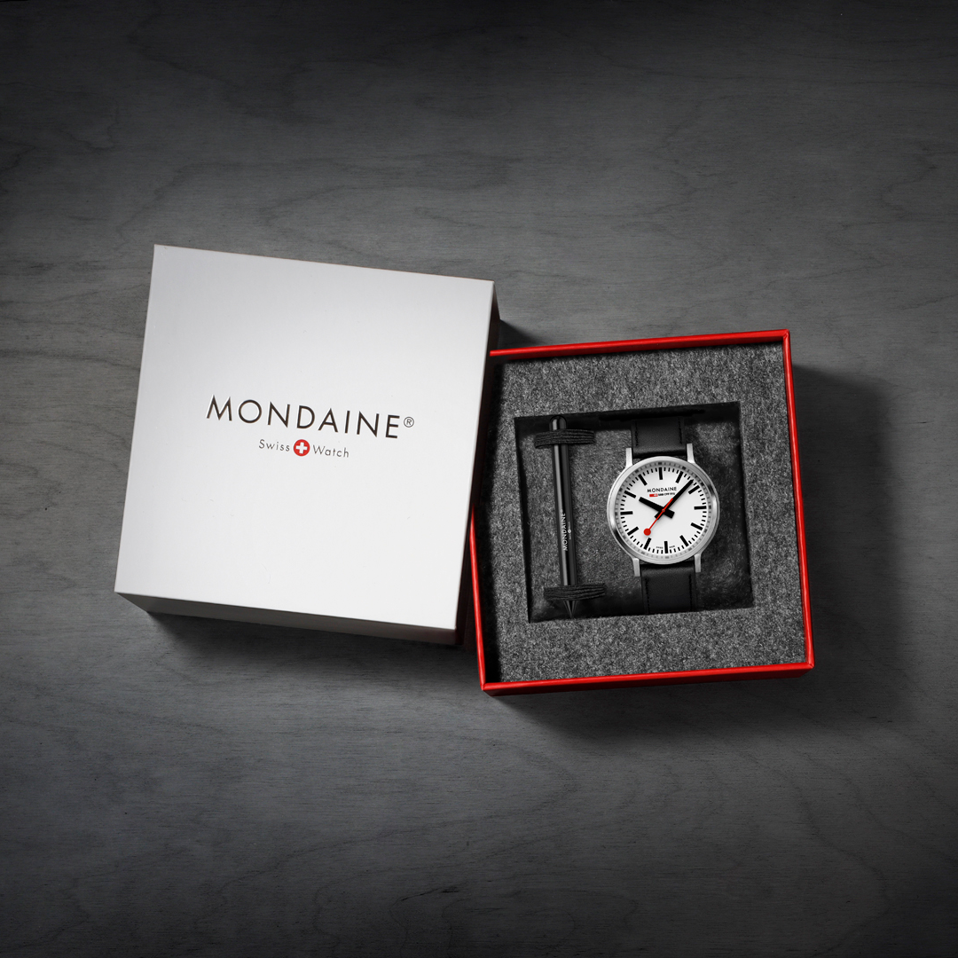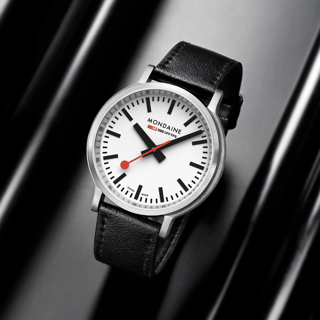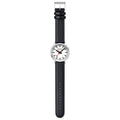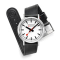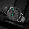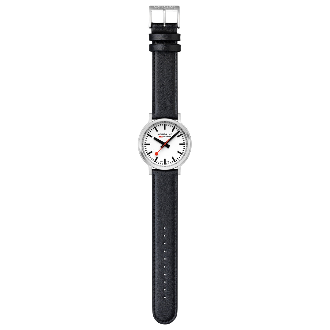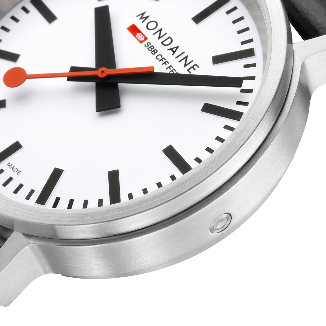 With its strikingly robust design featuring a crown-less case, the Stop2Go watch encapsulates the true essence of the iconic Swiss Railways station clock. The classic white dial and 41 mm brushed stainless steel case are paired with a black vegan grape leather strap. Equipped with the exclusive and unique Swiss Made stop2go movement resembling that of the Swiss Railways clock it showcases a 2-second time stop. The watch also features the patented BackLight technology that lets the underside of the hands glow and allows the time to be read in darkness. The watch comes with a time setting pen to easily adjust time and align hands.