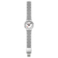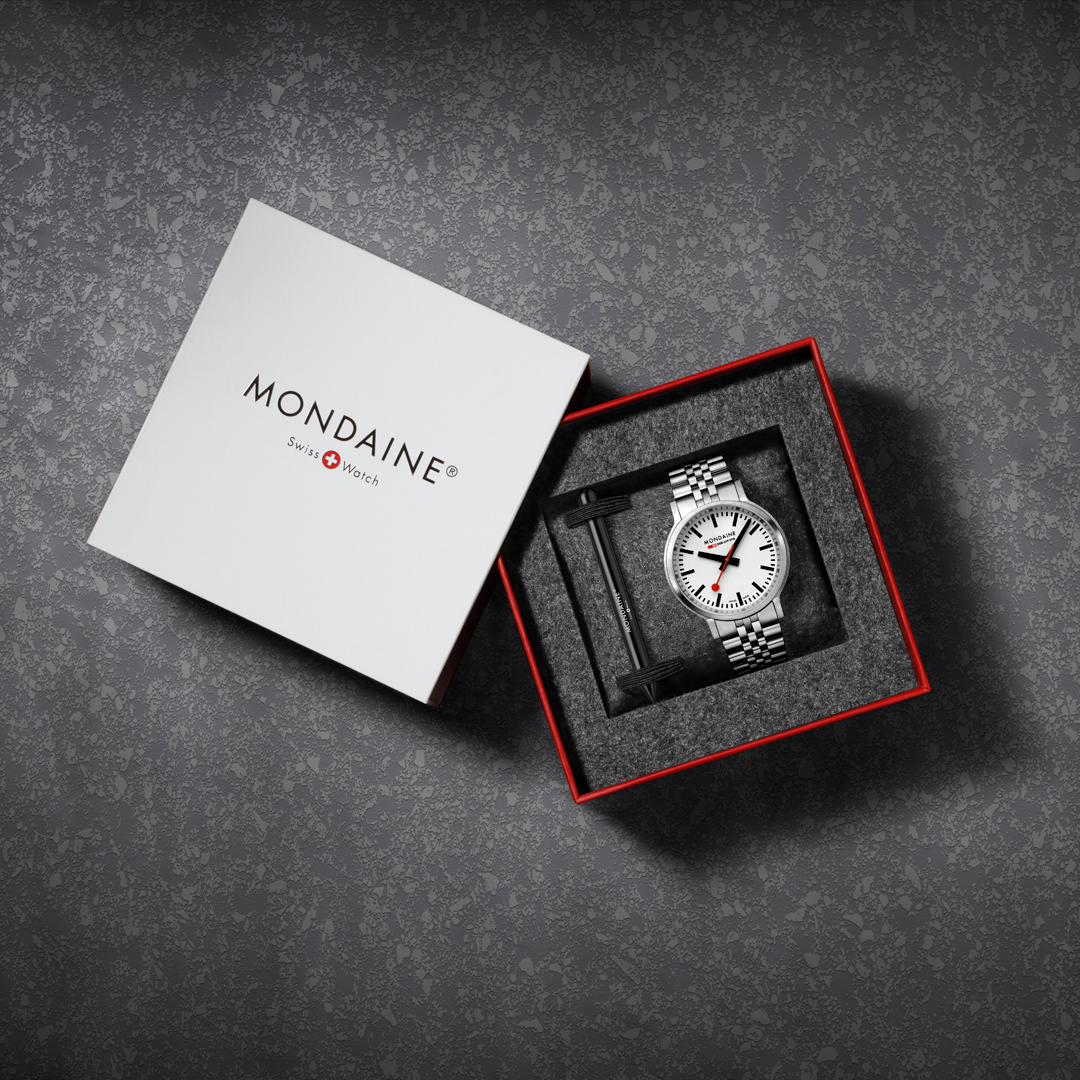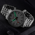 With its strikingly robust design featuring a crown-less case, the Stop2Go watch encapsulates the true essence of the iconic Swiss Railways station clock. The classic white dial and 41 mm brushed stainless steel case are paired with a black vegan grape leather strap. Equipped with the exclusive and unique Swiss Made stop2go movement resembling that of the Swiss Railways clock it showcases a 2-second time stop. The watch also features the patented BackLight technology that lets the underside of the hands glow and allows the time to be read in darkness. The watch comes with a time setting pen to easily adjust time and align hands.