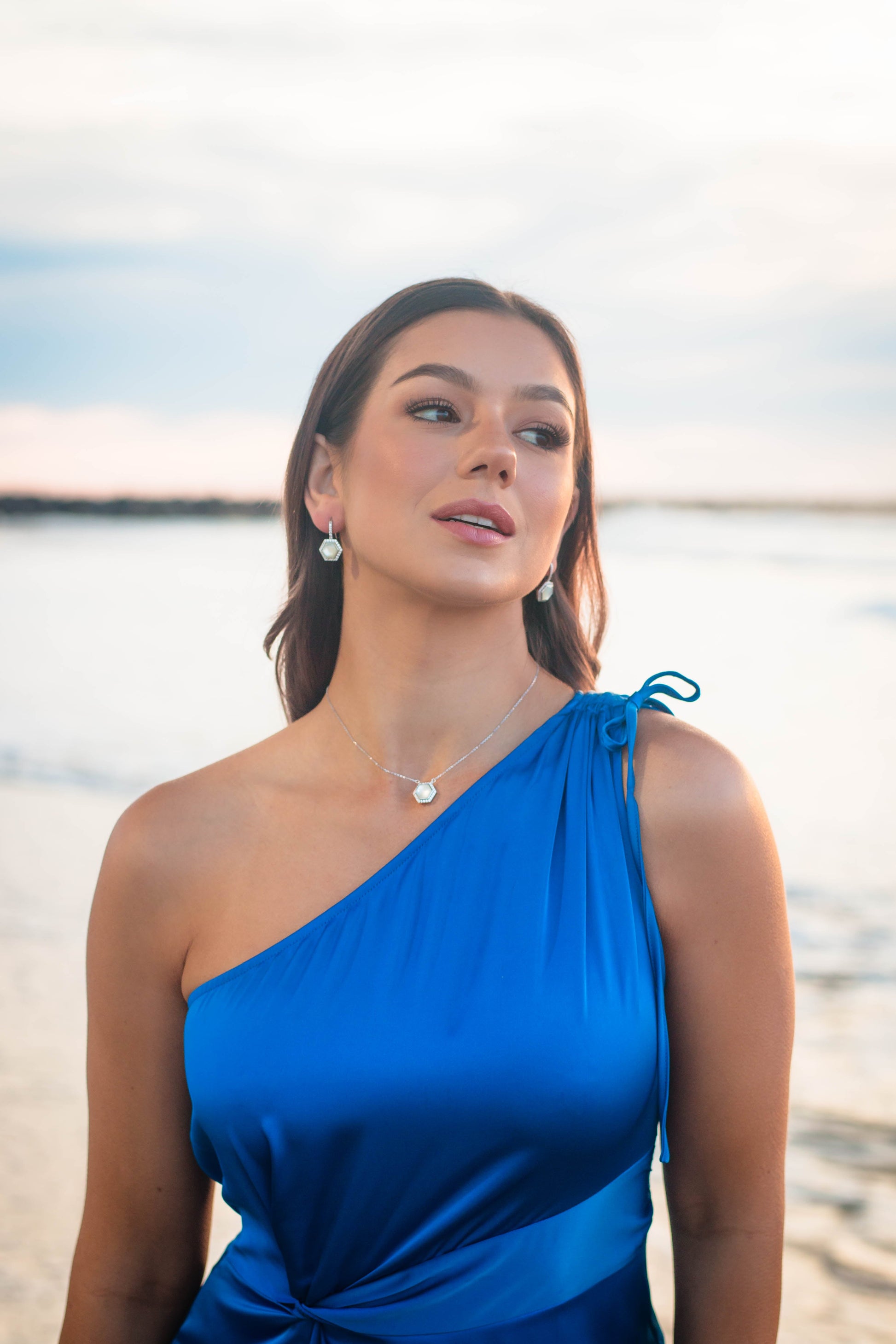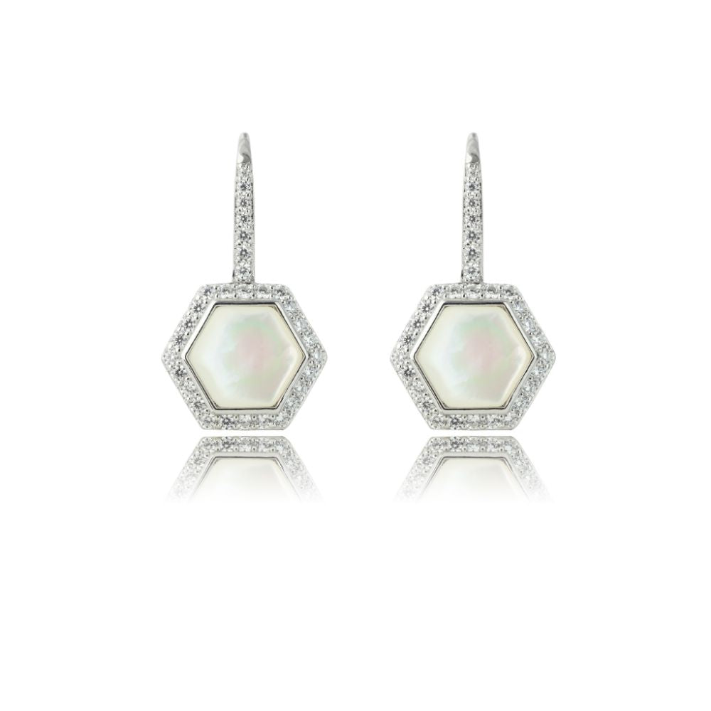 The Georgini Oceans Torquay Mother of Pearl Earrings are a modern and contemporary design. Mother of pearl is a beautiful, iridescent material derived from the inner shell of certain mollusc species, including abalone, oysters, and mussels. The Georgini Torquay Earrings feature a hexagon design pave set with sparkling Cubic Zirconia's. The Shepherds hook makes them comfortable and fabulous for everyday or special occasions. Inspired by the Victorian Sea Side Town of Torquay, a hub for surf culture and home to the famous Bells Beach, they are beautiful, just like the Coastal road driven to get there. They are crafted from Rhodium Plated 925 Sterling Silver.