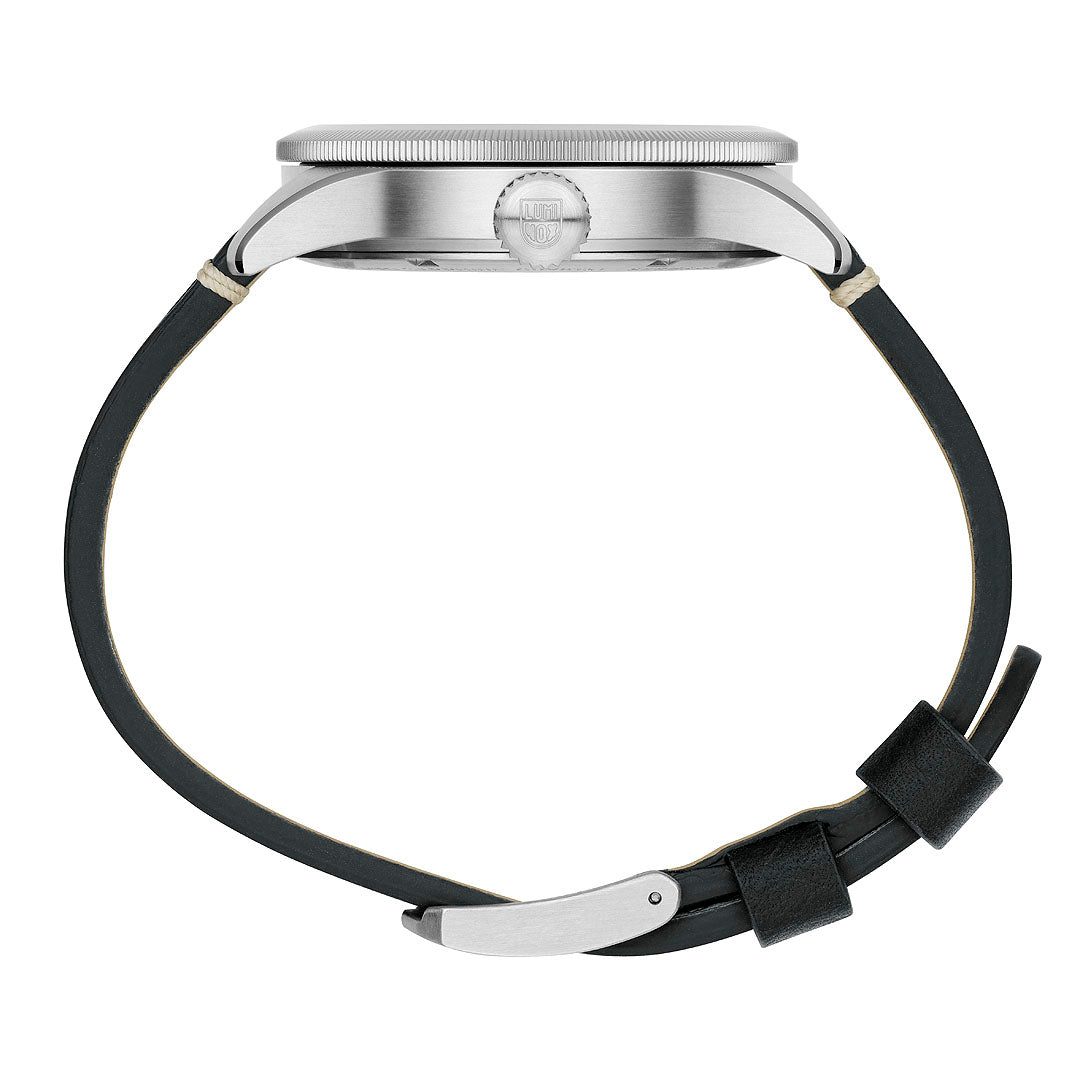 - Strap / bracelet: Black leather strap, stitched, with Luminox signature buckle
