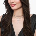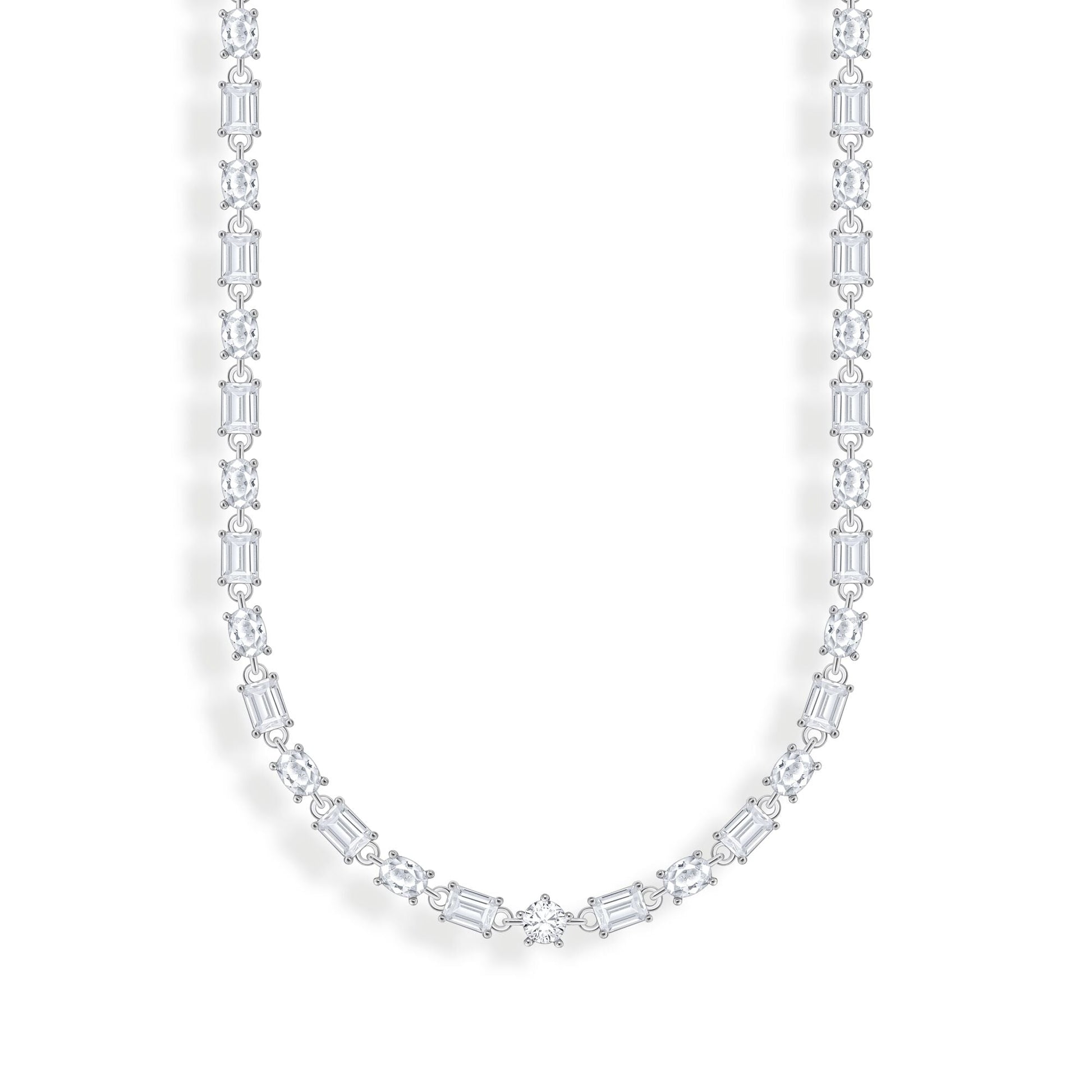 - Oval and rectangular white zirconia stones with sparkling facets nestle elegantly around the neck