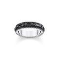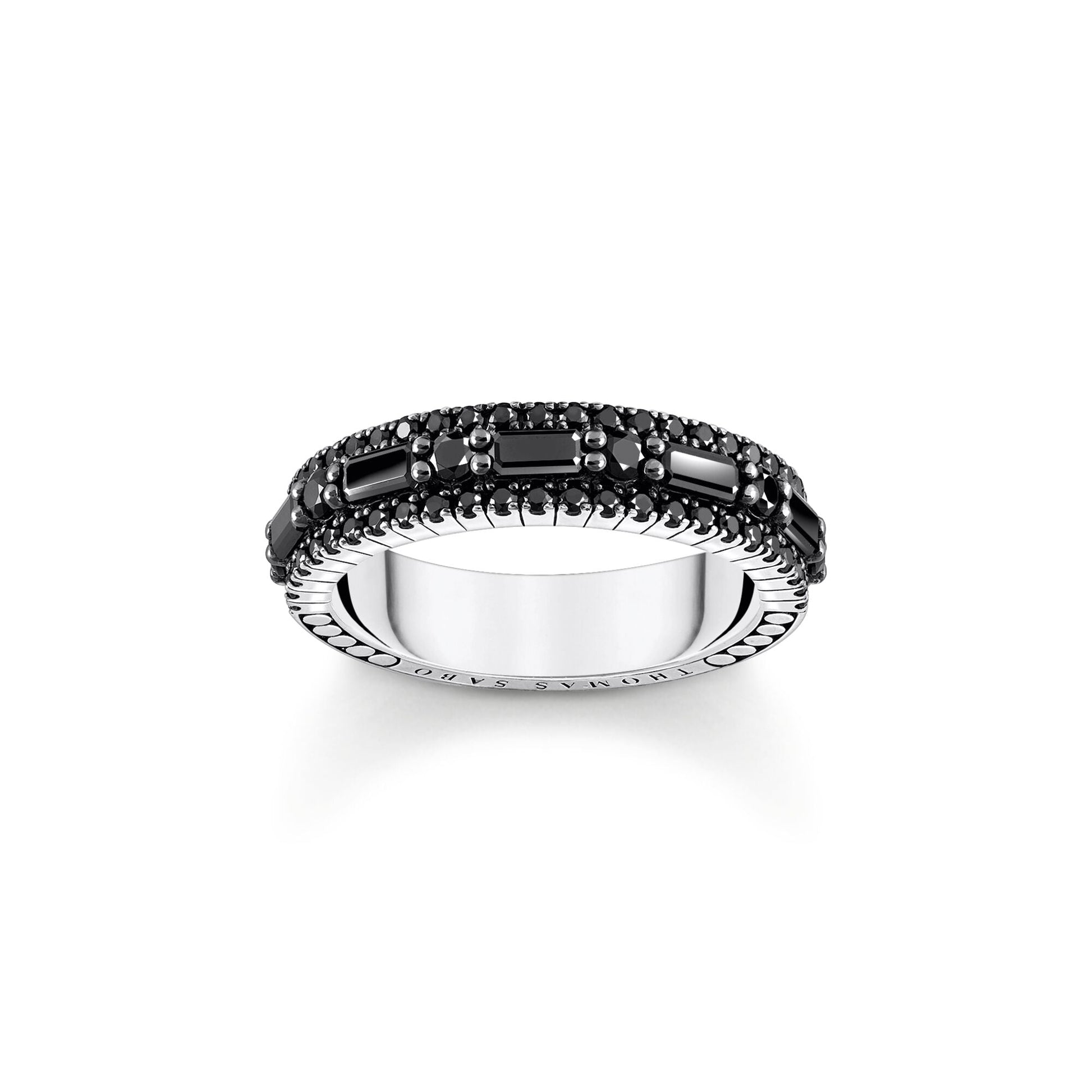 - Ring band decorated at the top with black zirconia stones in a pavé setting and with larger octagon-cut zirconia stones